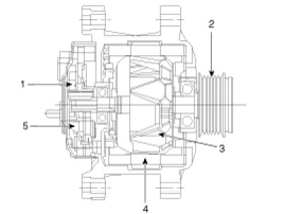 The alternator is regulated by the battery voltage detection system. The main components of the alternator are the rotor, stator, rectifier, capacitor brushes, bearings and V-ribbed belt pulley. The brush holder contains a built-in electronic voltage regulator.