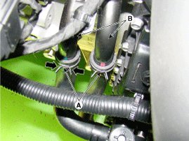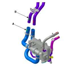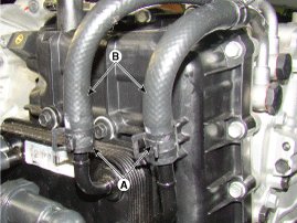 7. Disconnect the coolant hose (B) after removing the coolant hose clamp (A).