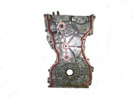 (5) The dowel pins on the cylinder block and holes on the timing chain cover should be used as a reference in order to assemble the timing chain cover to be in exact position.