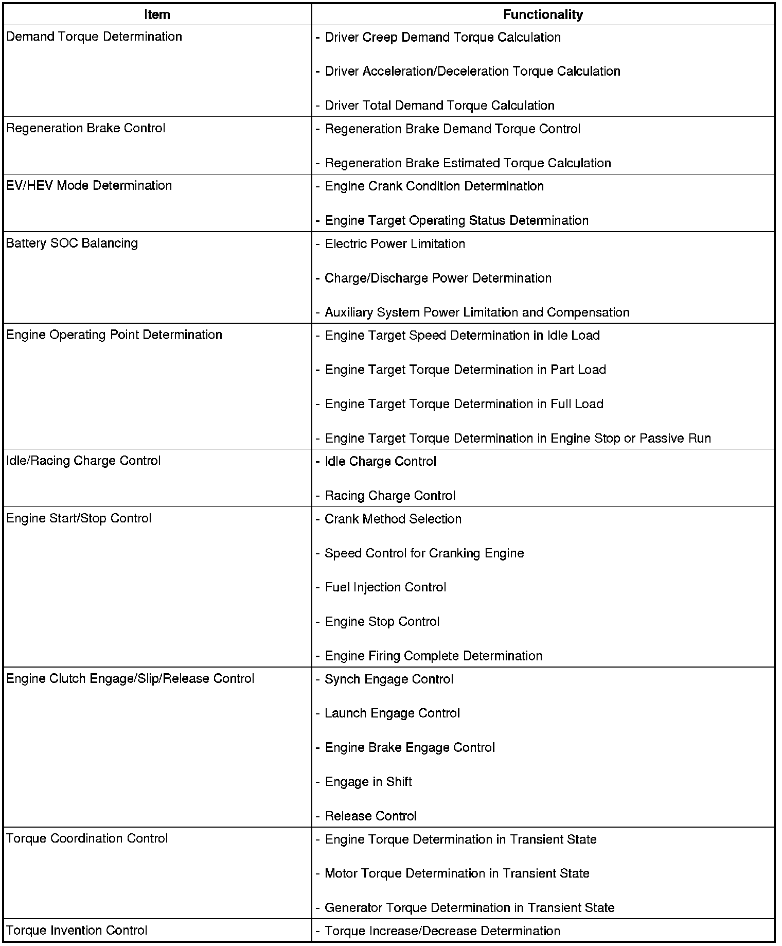 The HCU (Hybrid Control Unit) controls whole hybrid systems and is connected with each control modules (ECM, TCM, MCU, BMS ECU etc.) by CAN interface. In addition this system uses the brake switch and Clutch Pressure Sensor (CPS) signals for controlling the hybrid system.