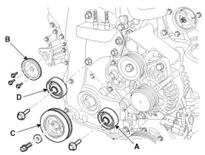 25. Remove the idler (A), the water pump pulley (B), the crankshaft pulley (C) and the drive belt tensioner pulley (D).