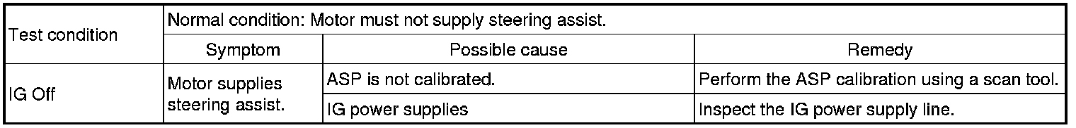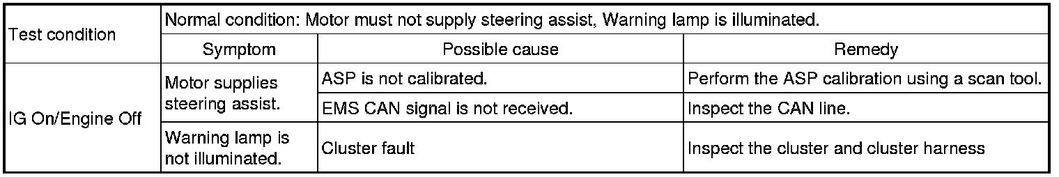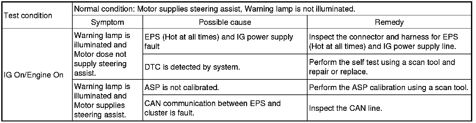 After or before servicing the EPS system, perform the troubleshooting and test procedure as follows. Compare the system condition with normal condition in the table below and if abnormal symptom is detected, perform necessary remedy and inspection.