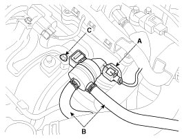 3. Disconnect the vapor hoses (B) from the purge control solenoid valve.