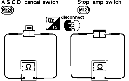 With brake pedal depressed, no continuity should exist at A.S.C.D. cancel switch. Release pedal, continuity should then exist.
