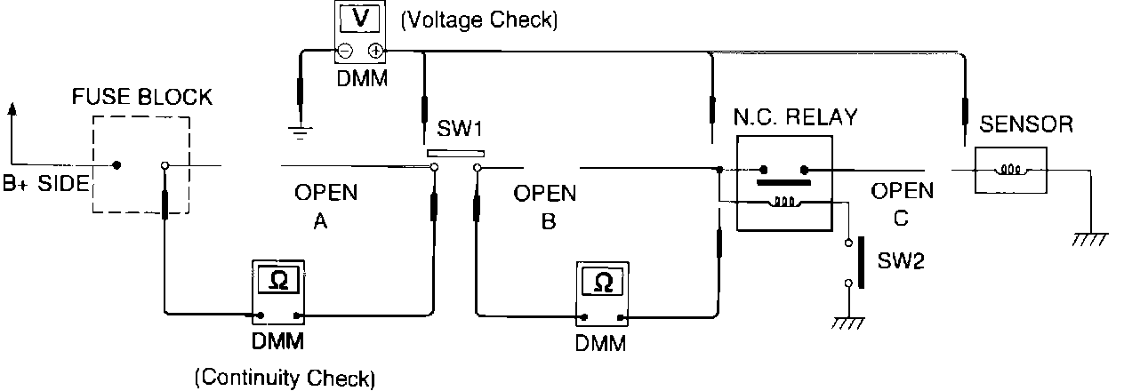 There are two types of tests you can use for tracking down an open circuit: the Continuity Check using an ohmmeter or Voltage Check using the voltmeter. Either test, properly done, will yield good results.