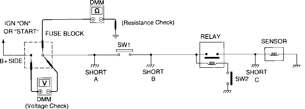 1. Remove the blown fuse and disconnect all loads (i.e. SW1 open, relay disconnected and sensor disconnected) powered through the fuse.