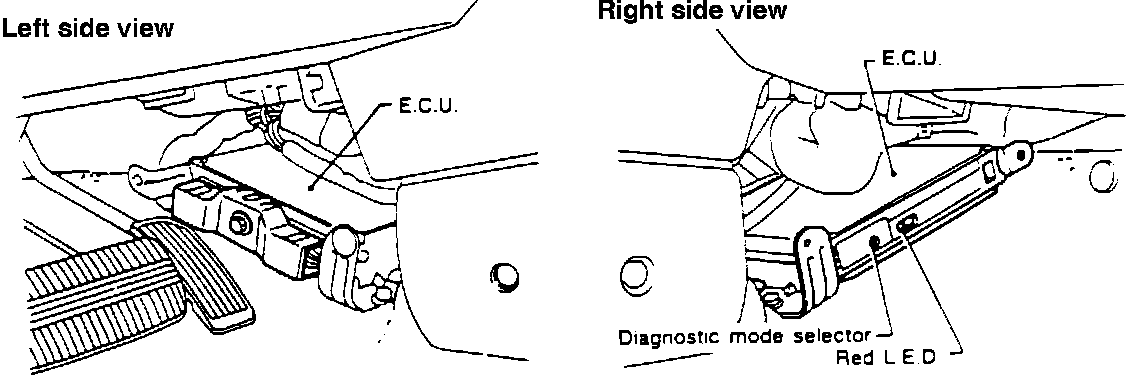The Electronic Control Unit (ECU) is located on the floor board in front of the center console.