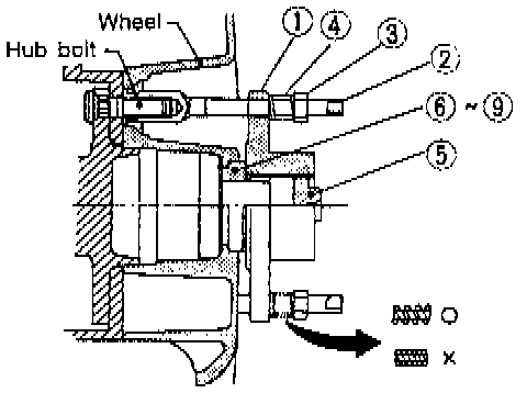 a. Select adapter which corresponds with wheel or hub shape from four type (Nos. 6 to 9), as shown.