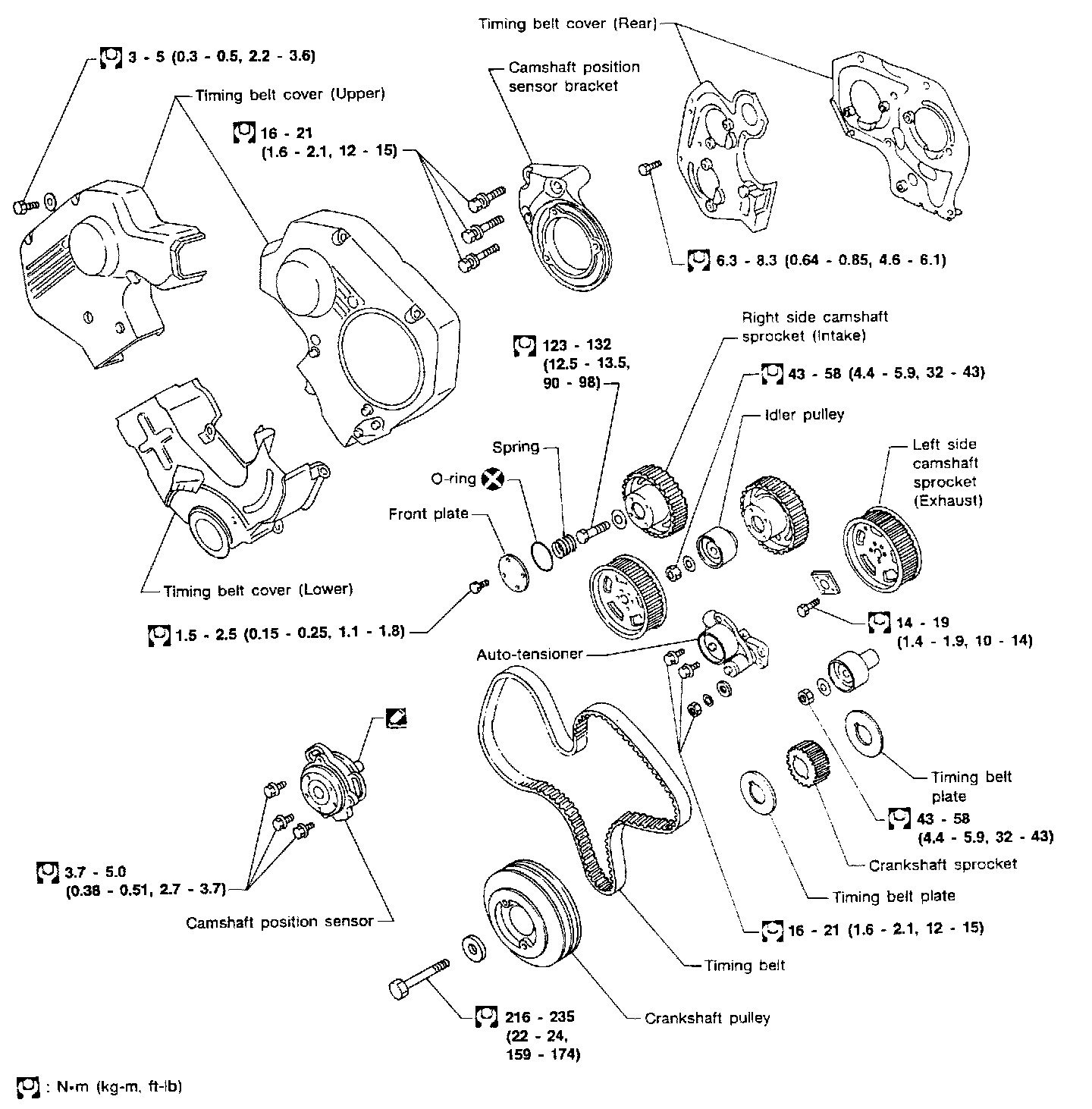 16. Confirm auto tensioner fixing nuts and bolts are tightened to 16 - 21 Nm (1.6 - 2.1 kg, 12 to 15 ft lb).