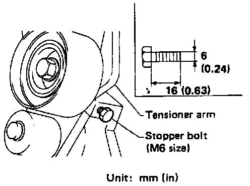 10. Install a suitable stopper bolt (M6) into tensioner arm of auto-tensioner so that auto-tensioner pusher does not spread out.