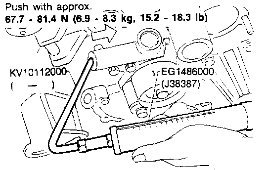 (1) Set plate and push it with 49 N (5 kg, 11 lb) force using Tool (push-pull gauge) at each position of timing belt mid-way between pulleys as shown.