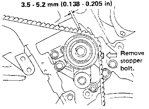 17. Remove the auto-tensioner stopper bolt. After 5 minutes check the projection of the rod (clearance between tensioner arm and pusher) stays at 3.5 - 5.2 mm (0.138 - 0.205 in).