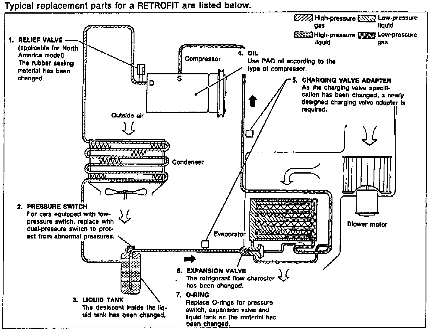 This technical Bulletin details the general service information for all models retrofitted to HFC-134a (R-134a) A/C systems, using a Infiniti approved kit.