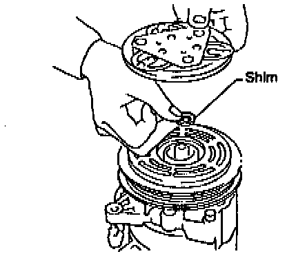 ^ Install the clutch disc on the drive shaft, together with the original shim(s). Press the clutch disc down by hand.