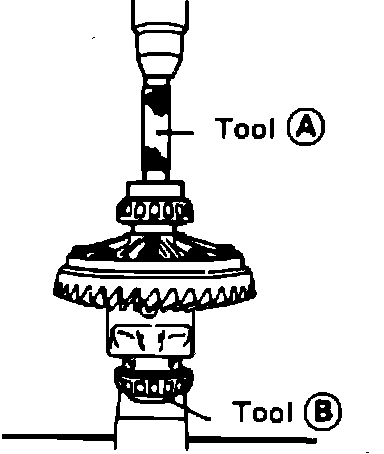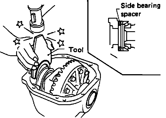 7. Press fit side bearing inner race on differential case with differential side bearing inner race installation and adaptor tools No. KV38100300 and ST3306100 or equivalents. Fig. 22.