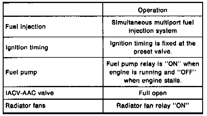 When the fail-safe system is operating, fuel injection, ignition timing, fuel pump operation, IACV-AAC valve operation and radiator fan operation are controlled under certain limitations.