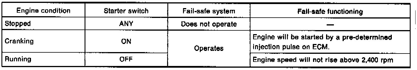 PURPOSEThe fail-safe system makes engine starting possible if there is something malfunctioning in the ECCS control module's (ECM's) central processing unit (CPU) circuit. in former models, engine starting was difficult under the conditions mentioned above. But with the provisions provided in this fail-safe system, it is possible to start the engine.