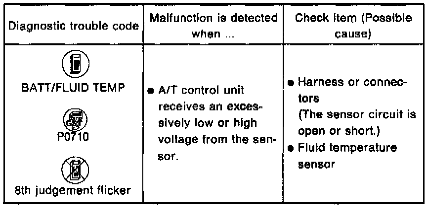 2. Drive vehicle under the following conditions: Shift lever in D, vehicle speed higher than 10 km/h (6 MPH), throttle opening greater than 1/8 of the full open position, engine speed higher than 450 rpm and driving for more than 10 minutes.