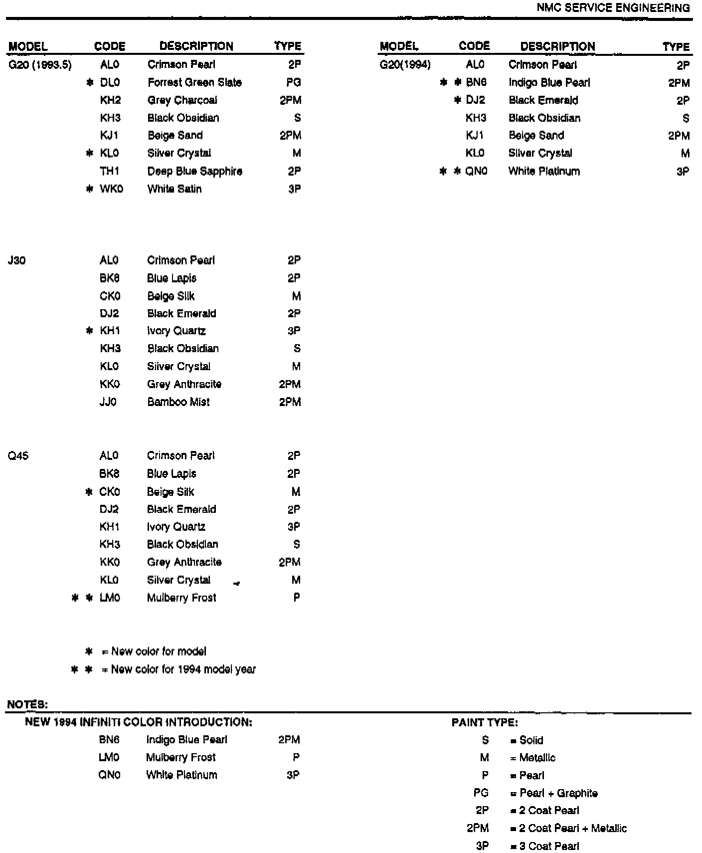 1994 INFINITI PAINT COLOR CODES