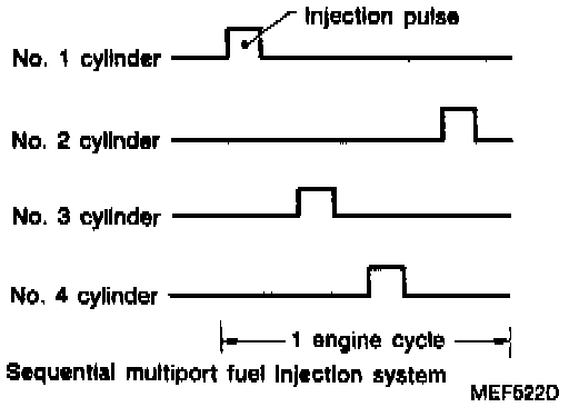 Fuel is injected simultaneously into all four cylinders twice each engine cycle. In other words, pulse signals of the same width are simultaneously transmitted from the ECM. The four injectors will then receive the signals two times for each engine cycle.