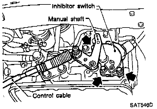 4. Insert 4.0 mm (0.157 in) dia. pin into adjustment holes in inhibitor switch and manual shaft. Insert the pin so that adjustment holes are correctly aligned with each other.