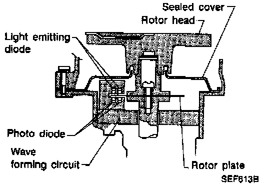 The distributor is operated by the camshaft. Mounted to the top of the distributor shaft is the rotor. Mounted to the top of the distributor housing is the distributor cap. This distributor is equipped with an optical Camshaft Position Sensor.