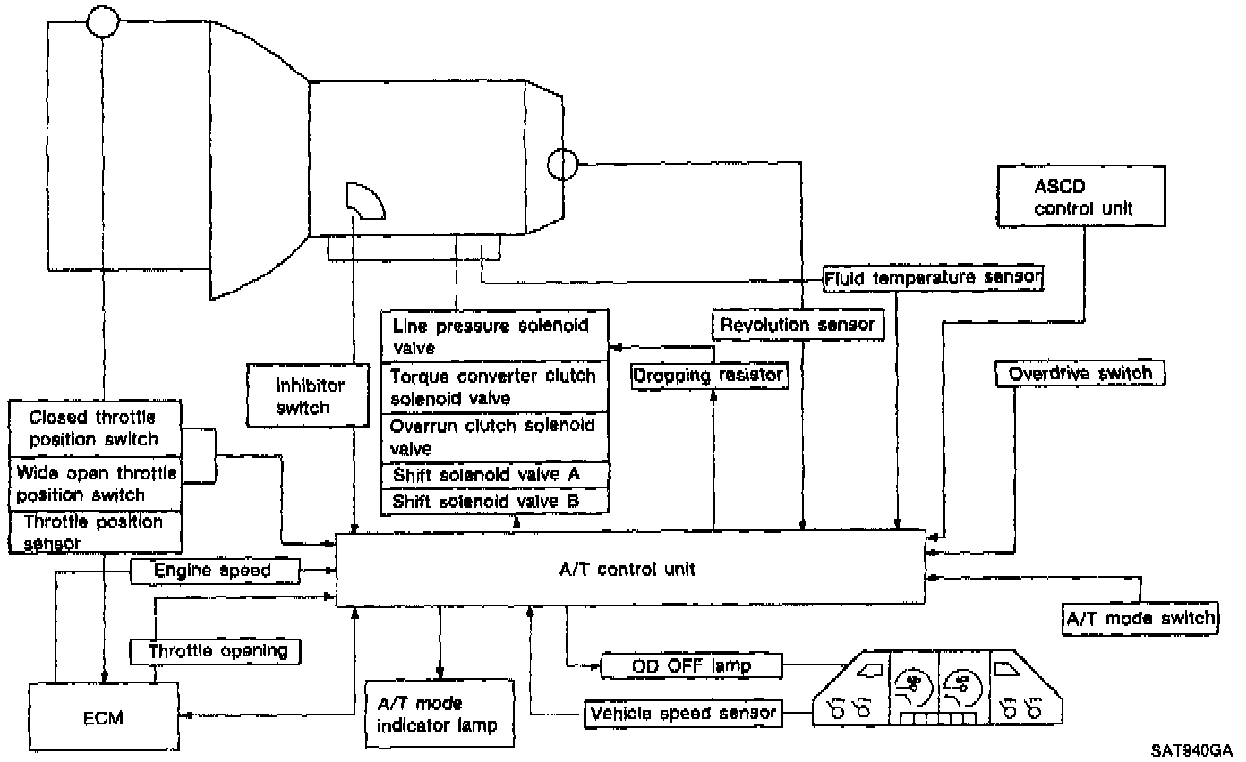 The A/T control unit receives signals sent from various switches and sensors. The control unit then determines required line pressure, shifting point, lock-up operation, engine brake operation. The unit sends required signals to the respective solenoids.