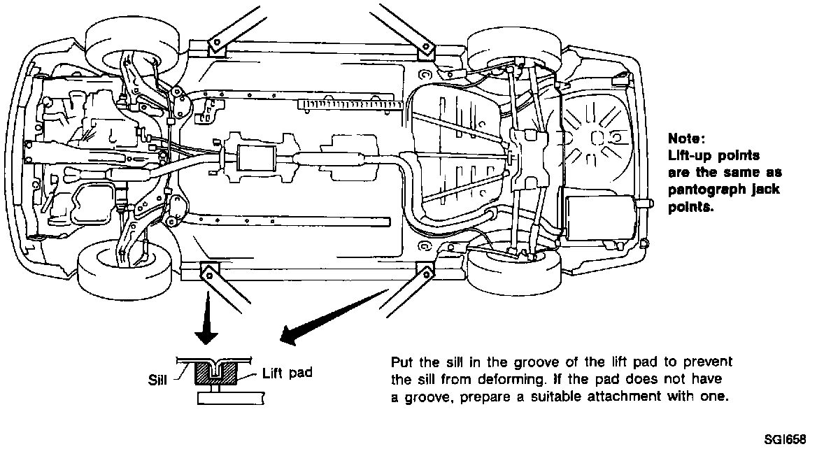 WARNING: When lifting the vehicle, open the lift arms as wide as possible and ensure that the front and rear of the vehicle are well balanced. When setting the lift arm, do not allow the arm to contact the brake tubes and fuel lines.