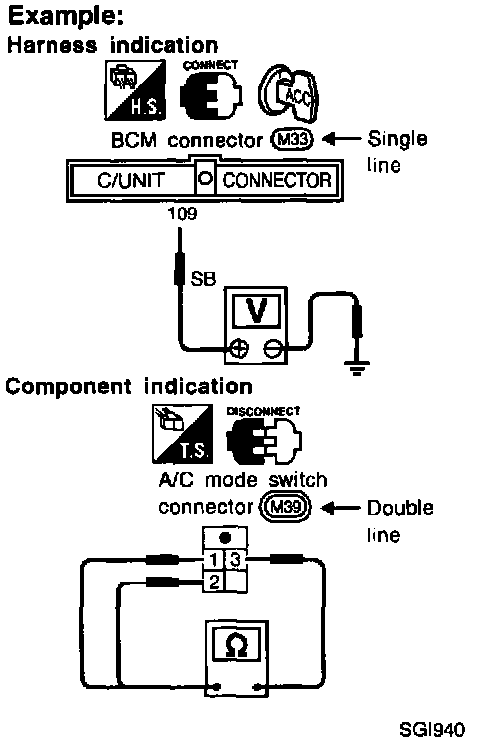 ^ Connector symbols shown from the harness side are enclosed by a double line and followed by the direction mark as shown in the right of the image
