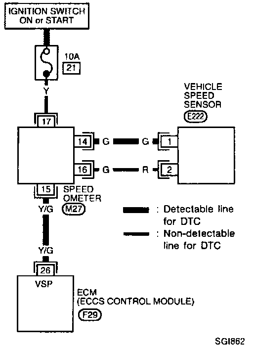 ^ A line with regular weight (wider line) represents a "detectable line for DTC (Diagnostic Trouble Code)". A "detectable line for DTC" is a circuit in which Engine Control Module ECCS control module (ECM) can detect its malfunctions with the on-board diagnostic system.