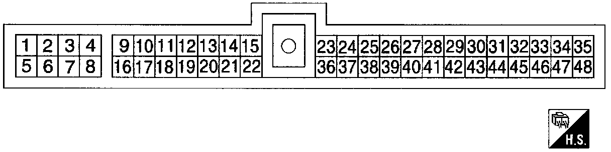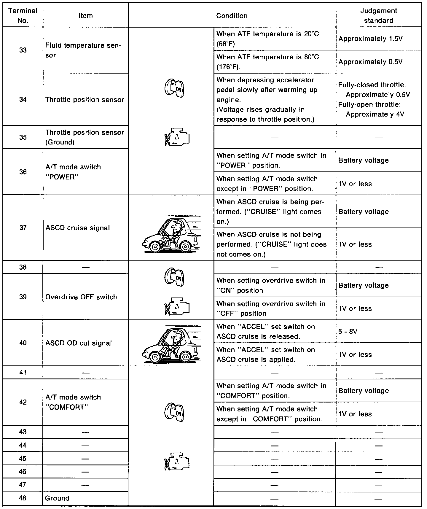 - Measure voltage between each terminal and terminal (15) or (48) by following "A/T CONTROL UNIT INSPECTION TABLE".