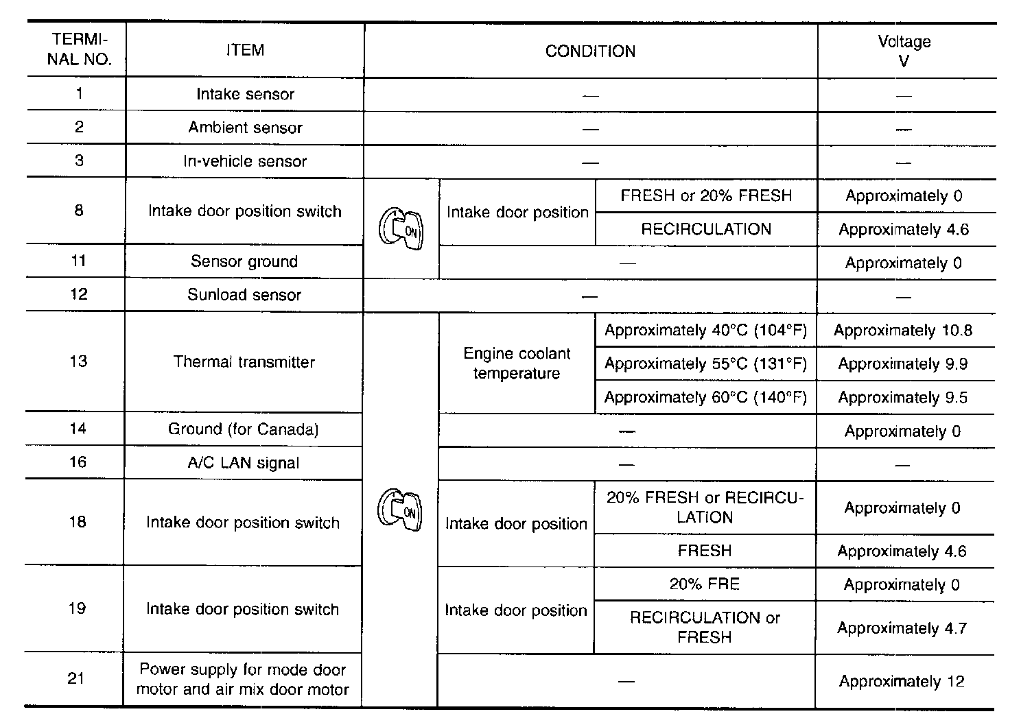 Measure voltage between each terminal and body ground by following "