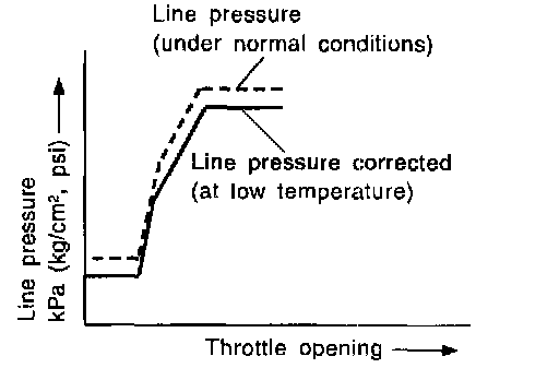 ^ Line pressure is increased to a maximum irrespective of the throttle opening when fluid temperature drops to -10°C (14°F). This pressure rise is adopted to prevent a delay in clutch and brake operation due to extreme drop of fluid viscosity at low temperature.