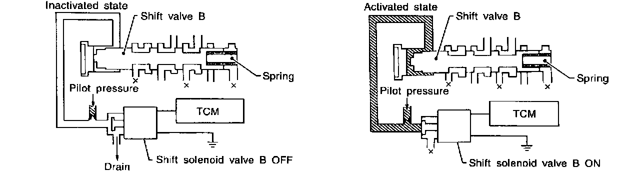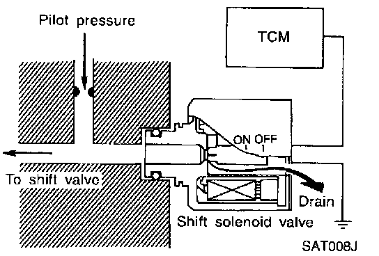 The shift solenoid valve performs simple ON-OFF operation. When set to "ON", the drain circuit closes and pilot pressure is applied to the shift valve.
