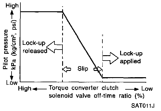 The torque converter clutch solenoid valve is controlled by the TCM. The plunger closes the drain circuit during the "OFF" period, and opens the circuit during the "ON" period. If the percentage of OFF-time increases in one cycle, the pilot pressure drain time is reduced and pilot pressure remains high.