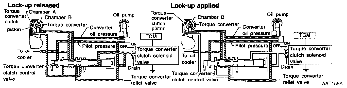 The torque converter clutch piston in the torque converter is locked to eliminate torque converter slip to increase power transmission efficiency. The solenoid valve is controlled by an ON-OFF duty signal sent from the TCM. The signal is converted to an oil pressure signal which controls the torque converter clutch piston.