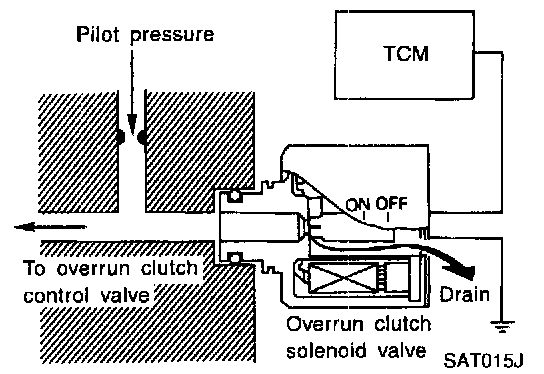 The overrun clutch solenoid valve is operated by an ON-OFF signal transmitted by the TCM to provide overrun clutch control (engine brake control).