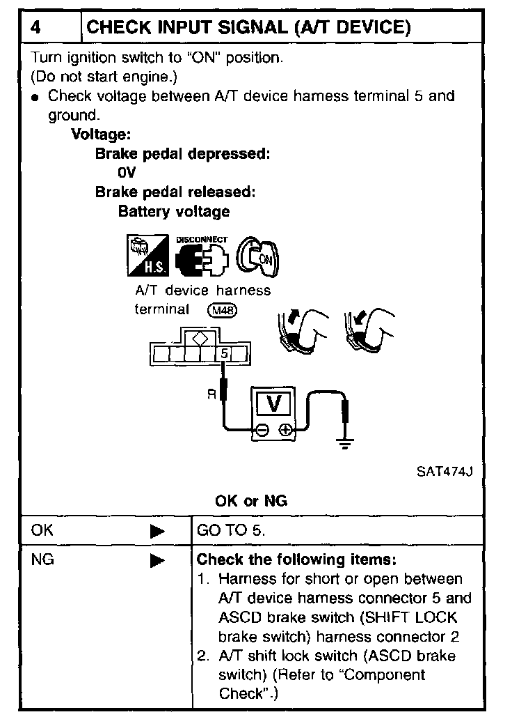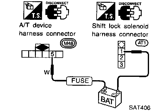 ^ Check operation by applying battery voltage to A/T device harness terminal 5 and shift lock solenoid & park position switch harness terminal 1.