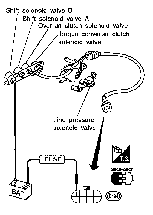 Shift solenoid valves A and B are turned "ON" or "OFF" by the TCM in response to signals sent from the PNP switch, vehicle speed and throttle position sensors. Gears will then be shifted to the optimum position.
