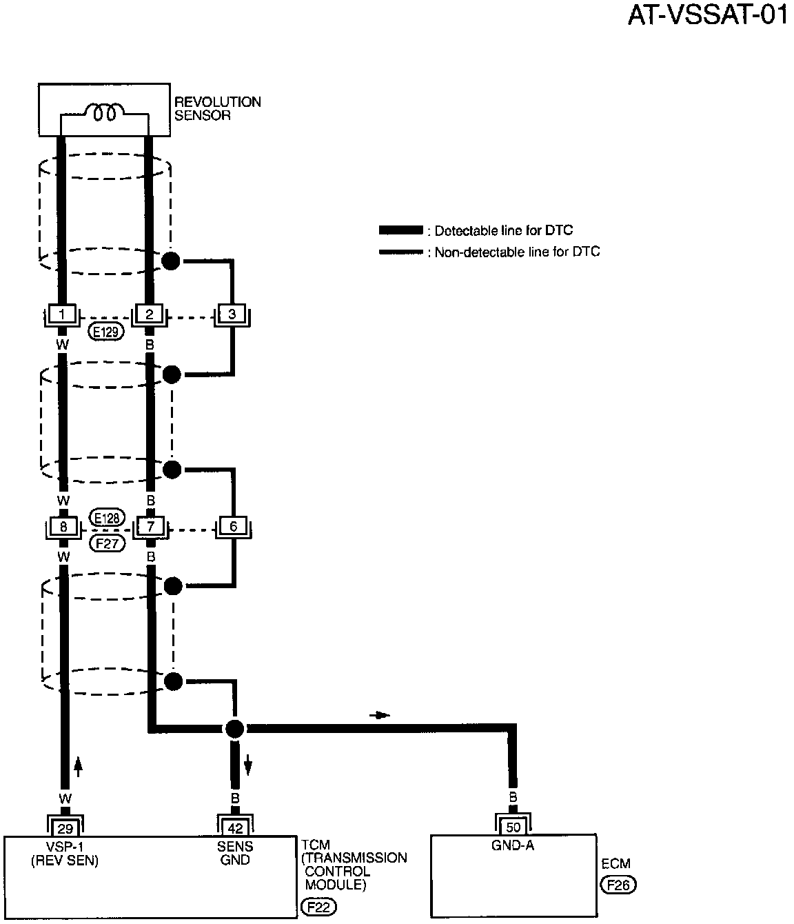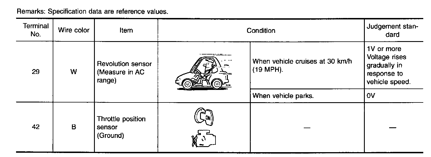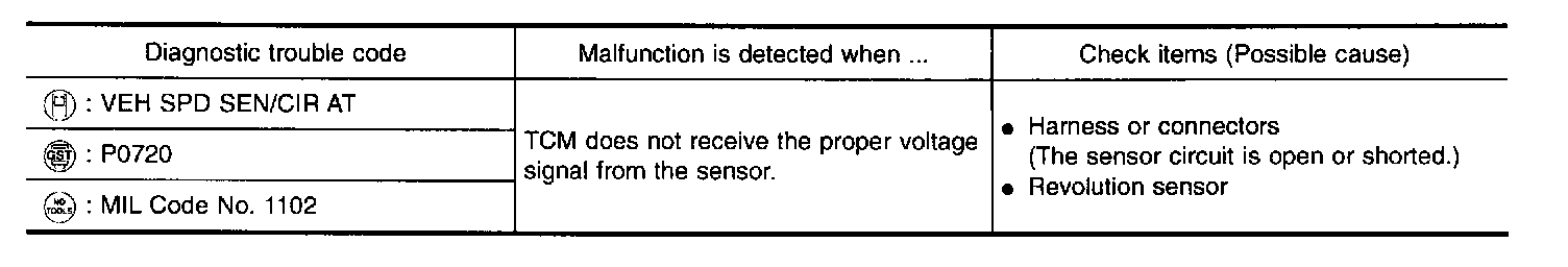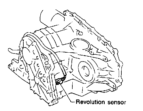 The revolution sensor detects the revolution of the idler gear parking pawl lock gear and emits a pulse signal. The pulse signal is sent to the TCM which converts it into vehicle speed.
