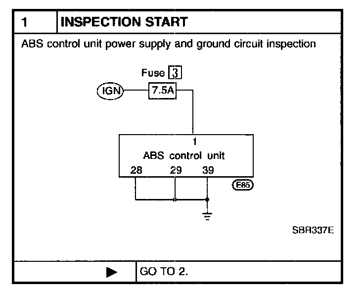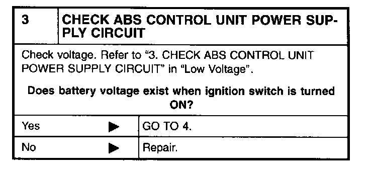 3 CHECK ABS CONTROL UNIT POWER SUPPLY CIRCUIT: