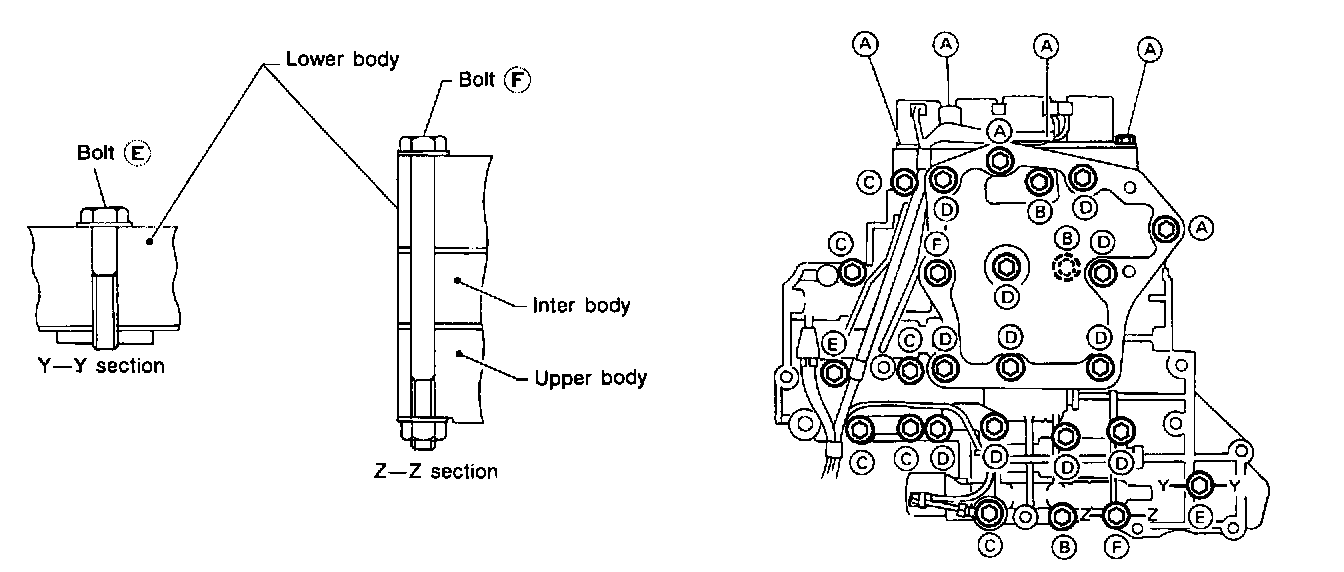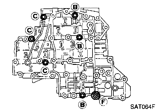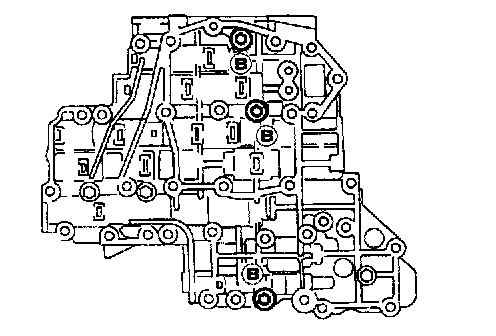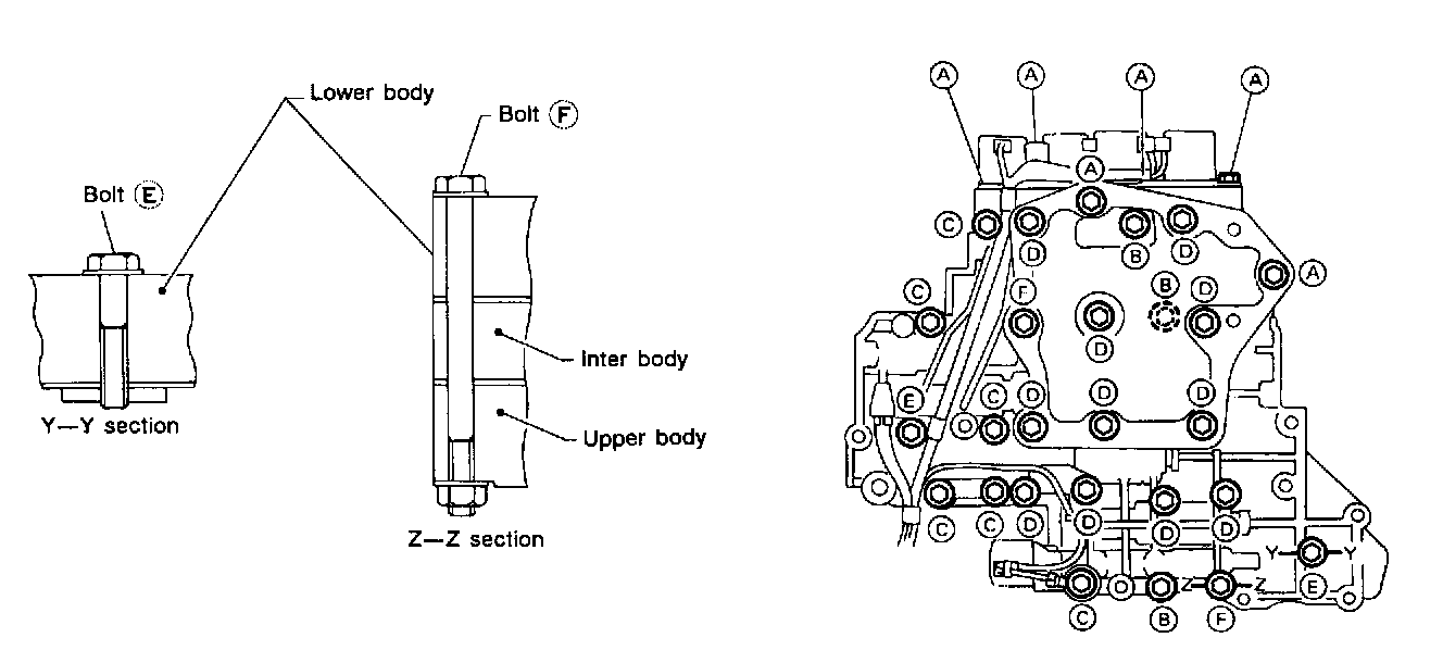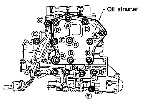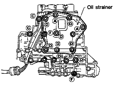 1. Remove bolts A, D and F. and remove oil strainer from control valve assembly.
