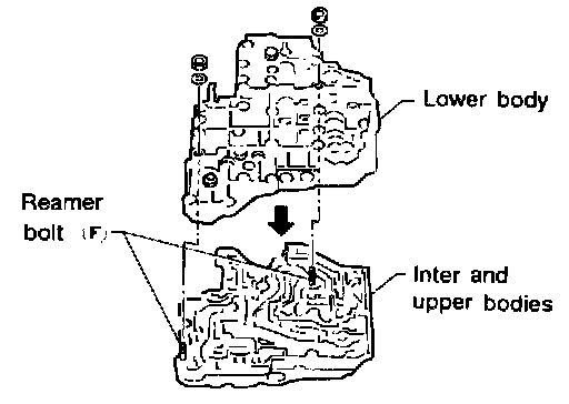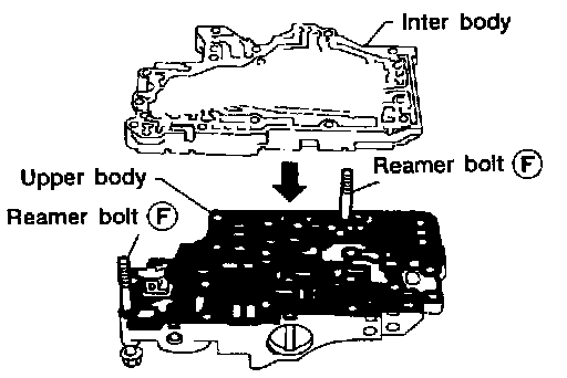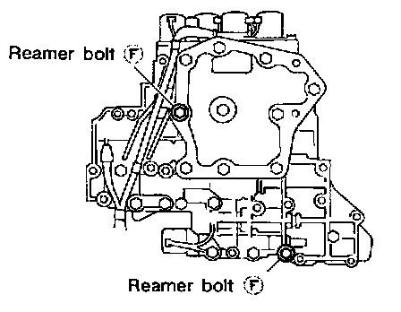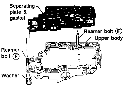 c. Install reamer bolts F from bottom of upper body. Using reamer bolts as guides, install separating plate and gaskets as a seat.