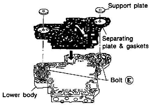 7. Remove bolts E, separating plate and separating gaskets from lower body.