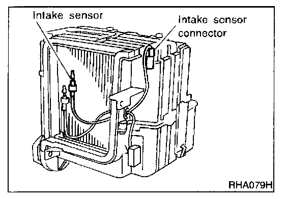The intake sensor is located on the cooling unit. It converts temperature of air after it passes through the evaporator into a resistance value which is then input to the auto amp.