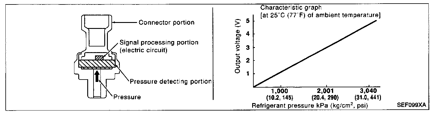 The refrigerant pressure sensor is installed at the liquid tank of the air conditioner system. The sensor uses an electrostatic volume pressure transducer to convert refrigerant pressure to voltage. The voltage signal is sent to ECM, and ECM controls cooling fan system.