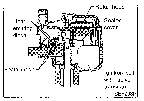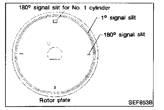 The camshaft position sensor has a rotor plate and a wave-forming circuit. The rotor plate has 360 slits for a 1° (POS) signal and 4 slits for a 180° (REF) signal. The wave-forming circuit consists of Light Emitting Diodes (LED) and photo diodes.