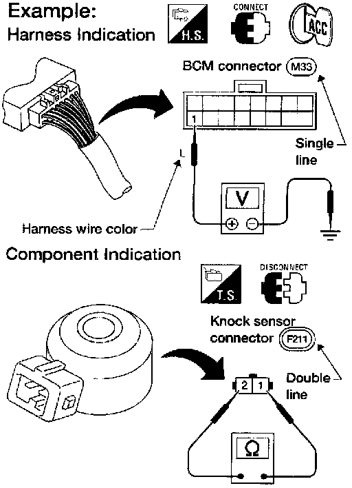 - Connector symbols shown from the harness side are enclosed by a double line and followed by the direction mark.