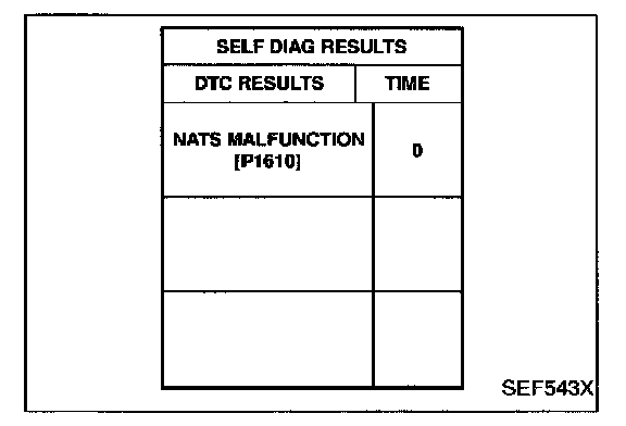 - If the security indicator lights up with the ignition switch in the "ON" position or "NATS MALFUNCTION" is displayed on "SELF-DIAG RESULTS" screen, perform self-diagnostic results mode with CONSULT-II using NATS program card. Refer to "IVIS (INFINITE Vehicle Immobilizer System - NATS)".