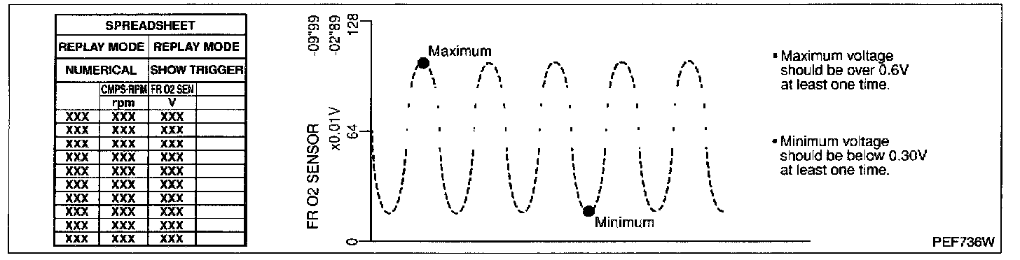 "RR O2 SEN-B1" should be above 0.48 V at least once when the "FUEL INJECTION" is +25%."RR O2 SEN-B1" should be below 0.43 V at least once when the "FUEL INJECTION" is -25%.